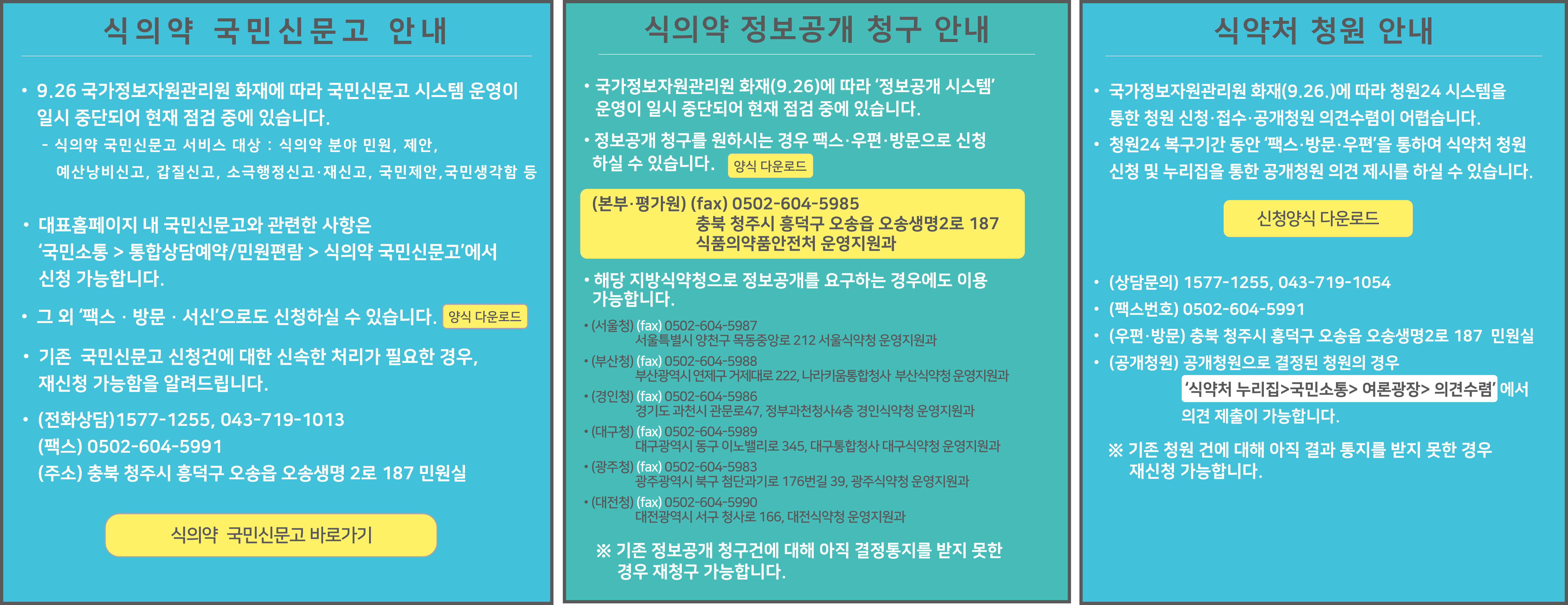 청원24 복구기간 동안 ‘팩스·방문·우편’을 통하여 식약처 청원 신청 및 누리집을
